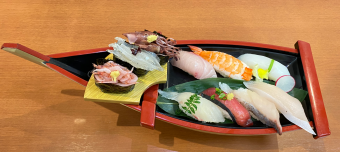 舟盛りの中に桜エビ・生シラウオ・ホタルイカの軍艦など