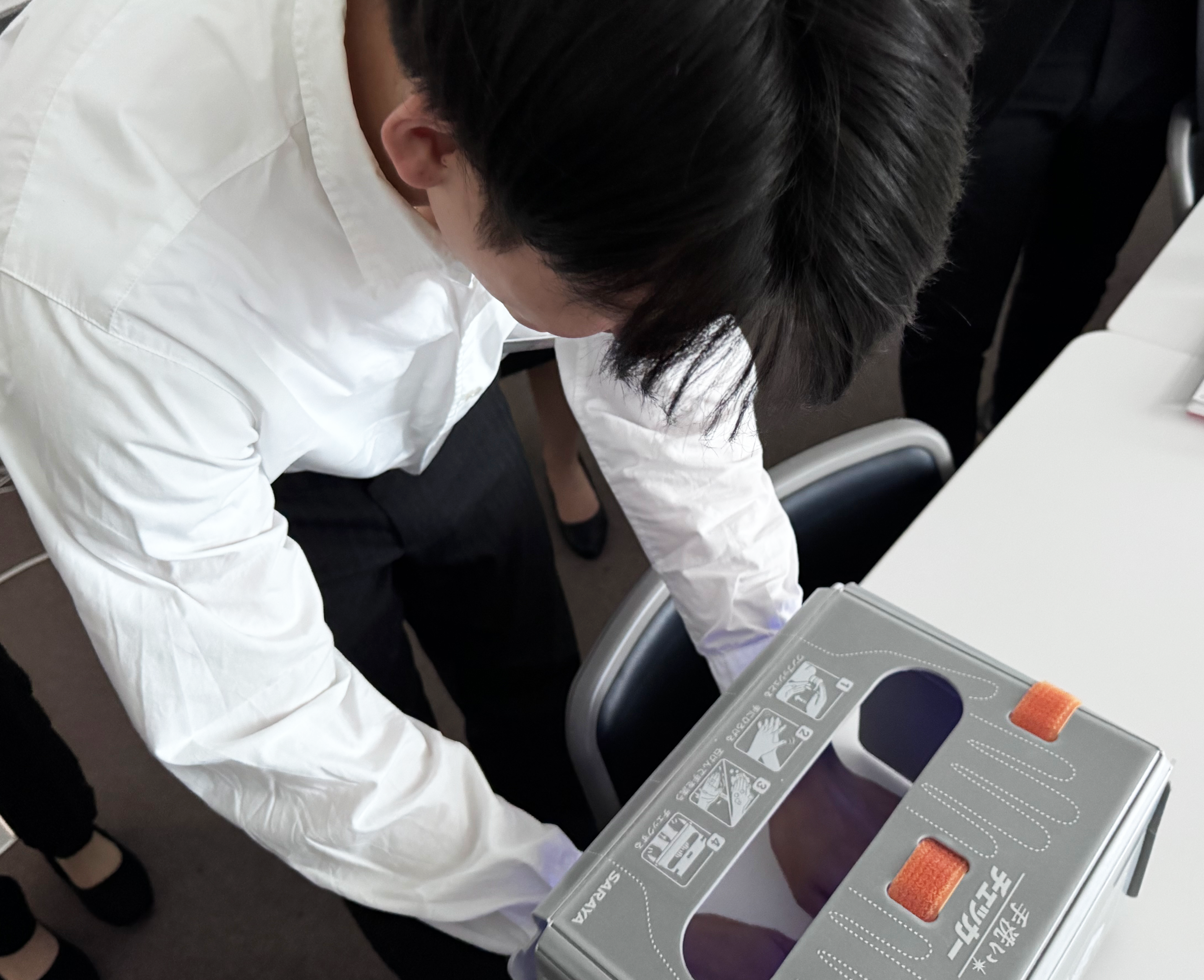 手洗い後にどれだけ雑菌が手に潜んでいるか専用ライトで照らしてみると…